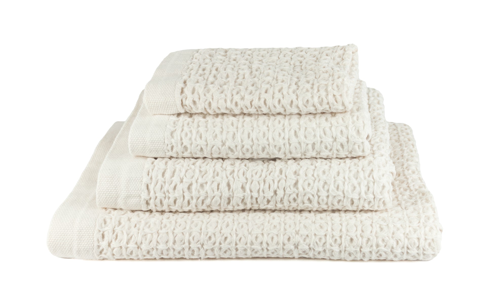 An airy, classic waffle pique towel in ivory and creme. The more purist version of the Heather Waffle towel with the same light touch due to a 30% linen structure comes in clean and bright colours for wellbeing in your bathroom. 70% cotton, 30% linen, made in Japan.