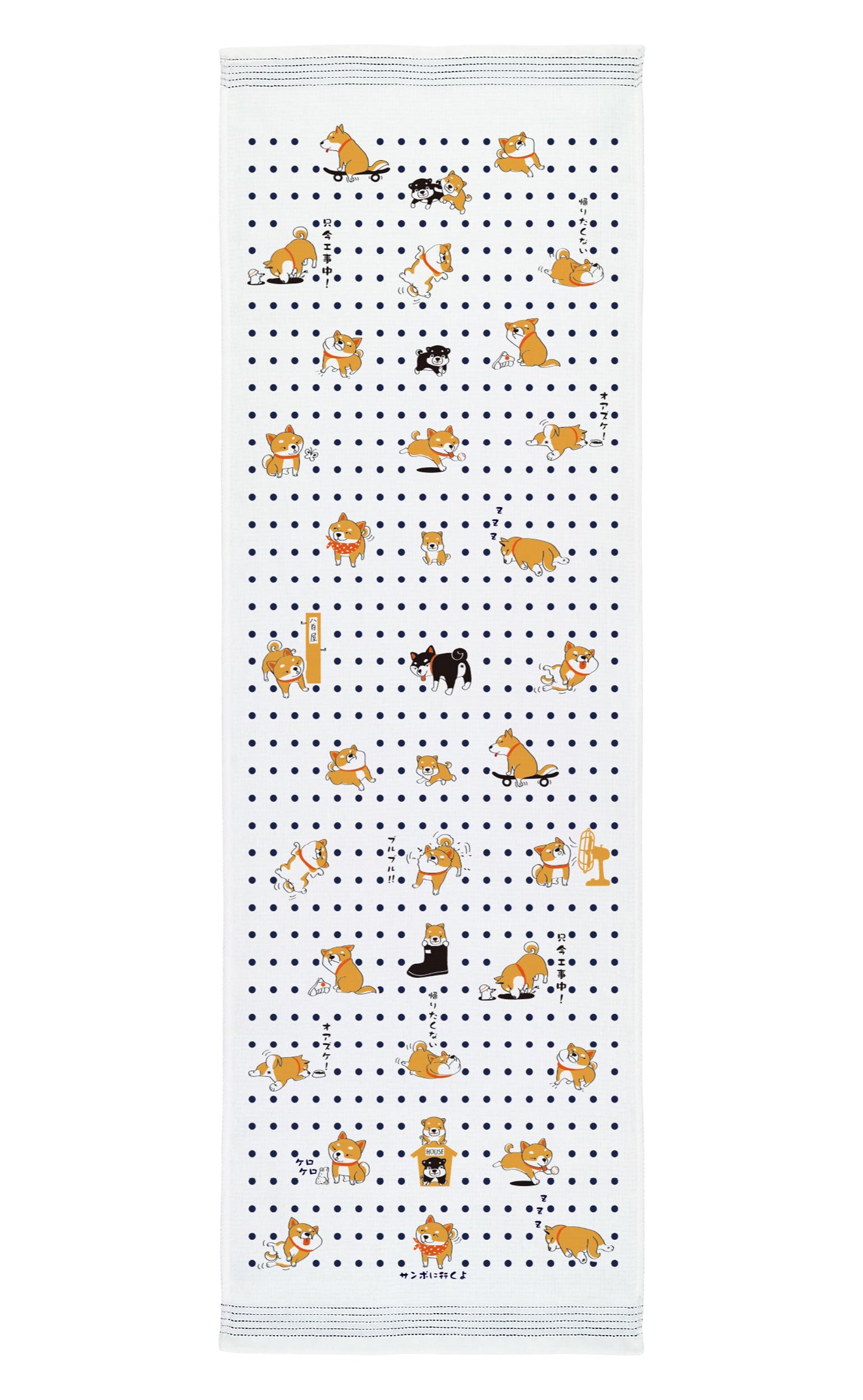 Crafted from 100% lightweight, quick-drying cotton and measuring 33x100 cm, it features a delightful pattern of cheerful Shiba Inus – some sitting, some smiling, others caught mid-dance – scattered between small dark blue dots. The charming illustrations capture the mischievous spirit and lovable energy of this iconic Japanese dog breed.
