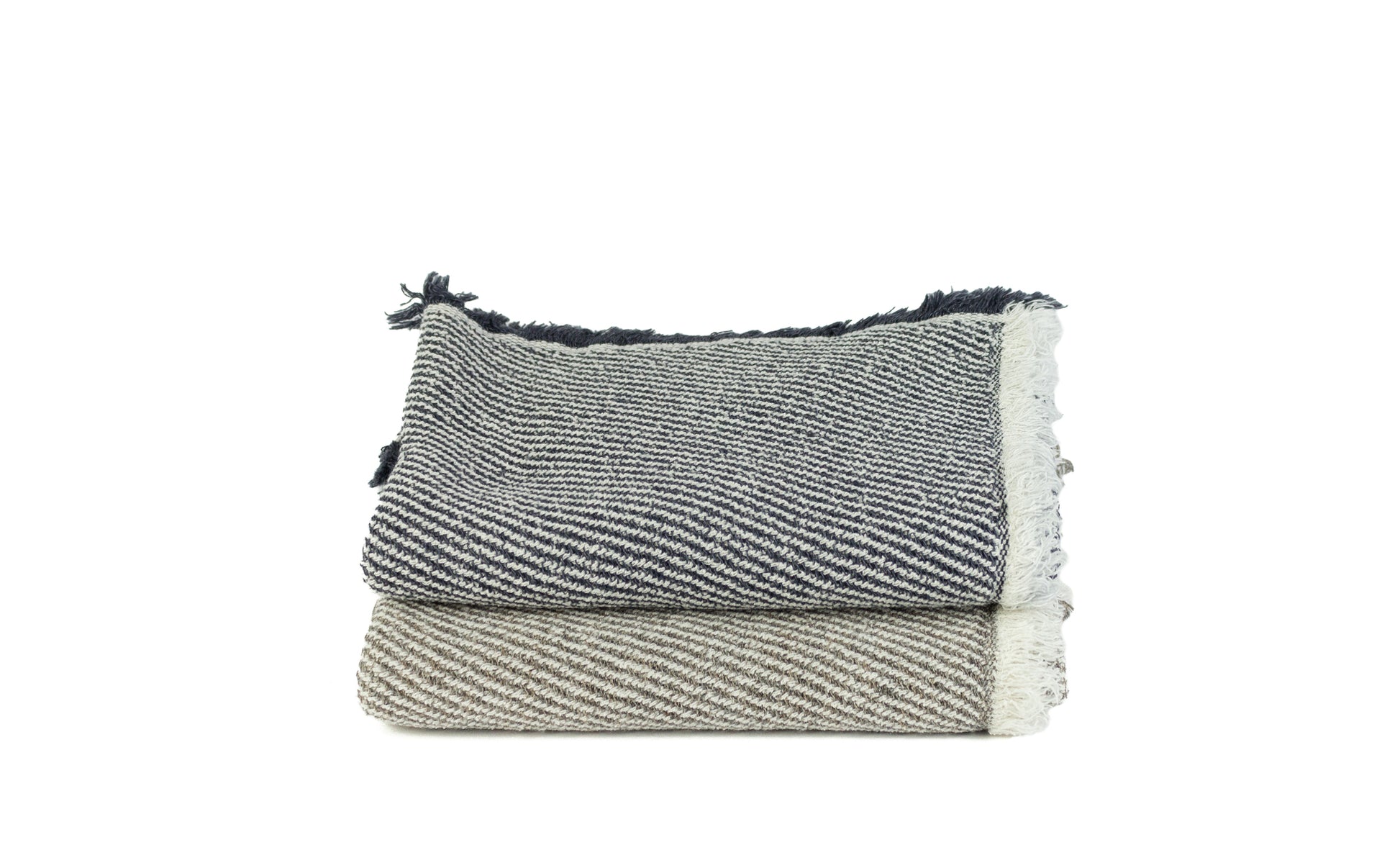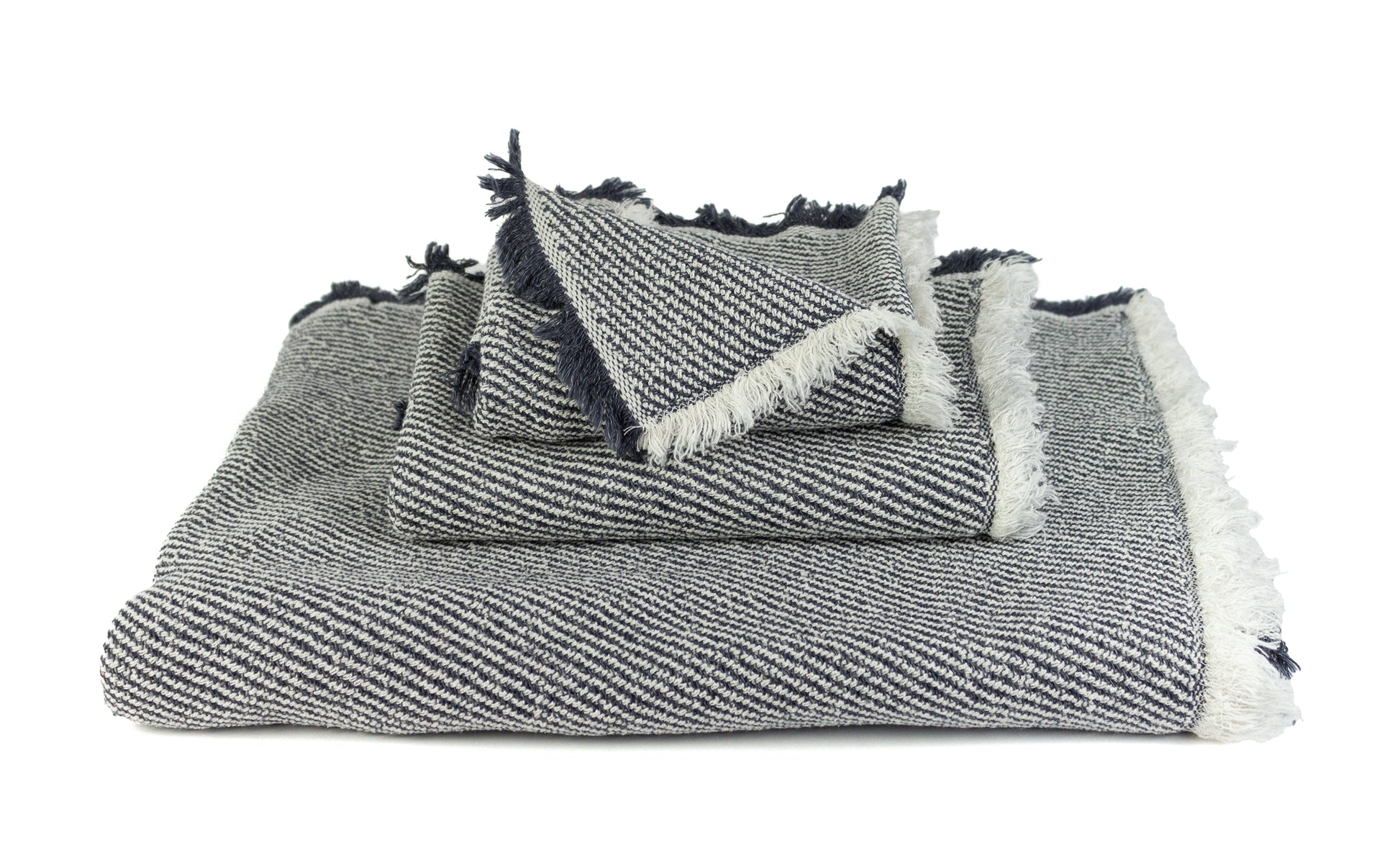 This adventure-ready towel has a heavy, coarse texture that dries quickly. Its pileless, oblique-cord design features short fringe trim at the sides. It makes the perfect beach or sauna towel. Made of 100% cotton in Japan, the Swell navy towel is available in two colors and three sizes.
