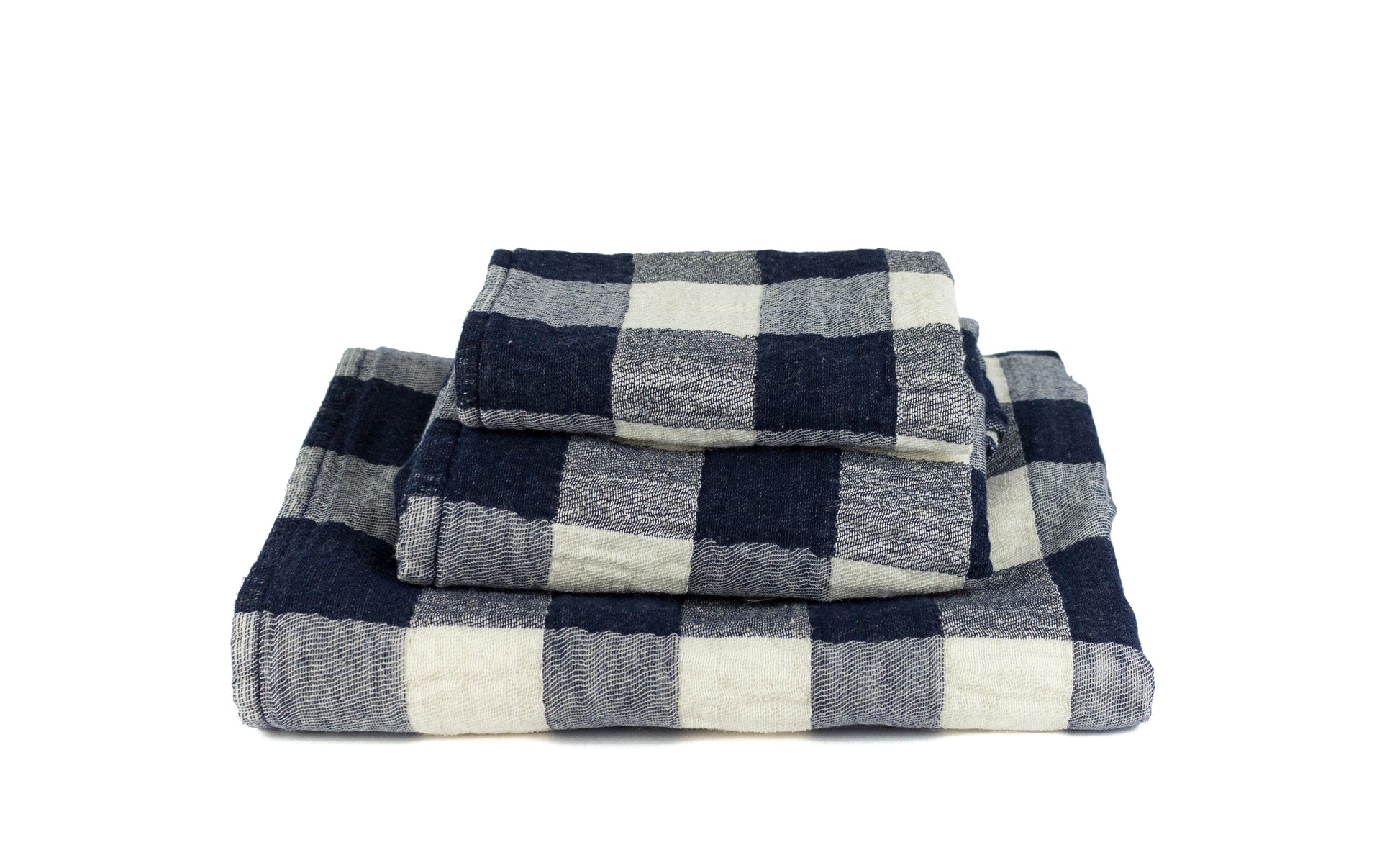 The checked pattern refers to Swiss chalets and childhood memories. You get a soft touch with 100% organic cotton terrycloth on one side, and firmer cotton linen gauze on the other. 80% cotton, 20% linen. Available in two colours and three sizes.